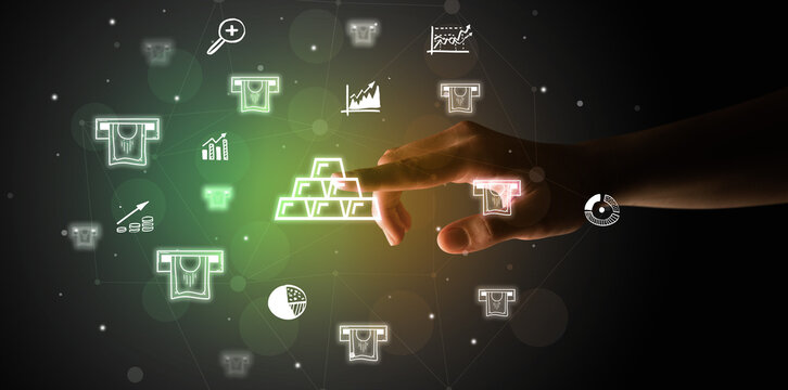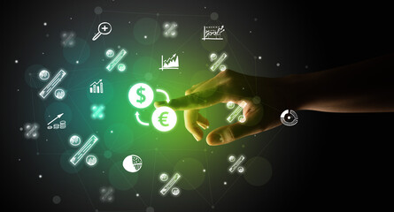 Businessman finger touching on screen multimedia interface with hand drawn currency icons