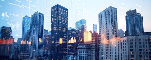 Digital candlestick charts and trading indicators overlay sunny skyscrapers, symbolizing growth and market trends in a vibrant financial setting. Double exposure effect. Forex trade market.