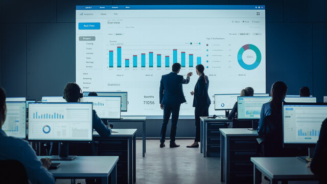 Two Traders Having a Meeting in a Modern Monitoring Office with Analytics Feed on a Big Digital Screen. Monitoring Room with Brokers and Finance Specialists Sit in Front of Computers. Colleagues Talk.