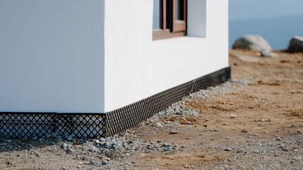 Modern minimalistic exterior, white building corner with sleek black mesh base protection, compacted dirt ground, strong lines and high contrast lighting, clean stock photo aesthet
