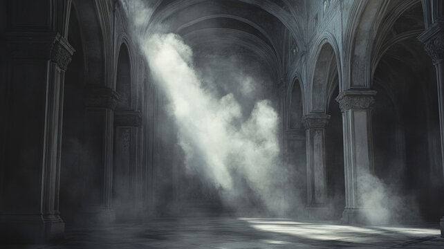Gothic cathedral interior with misty light beams, ancient stone arches, mysterious fog, and eerie atmosphere.