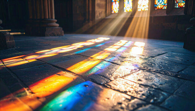 Vibrant stained glass casting kaleidoscope light on chapel floor