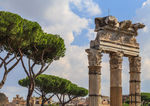 Crown Mediterranean pine trees next to an ancient colonnade in Rome
