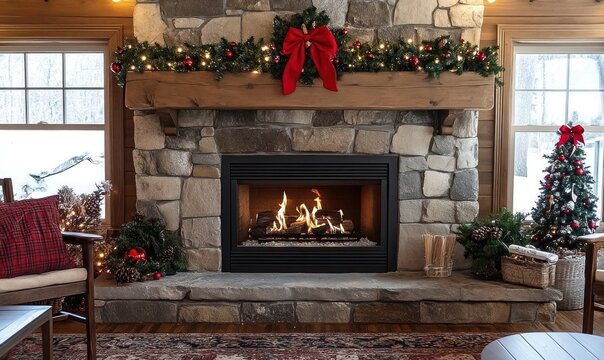 Stone Fireplace with Christmas Decorations and a Burning Fire