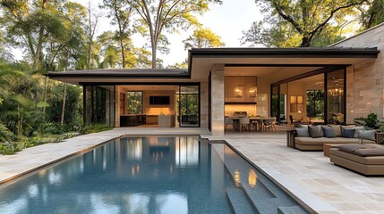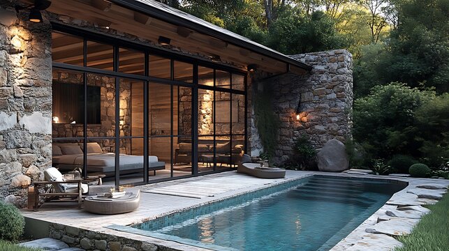 Luxurious modern wooden and stone house with natural pool in a lush green courtyard under sunny sky.