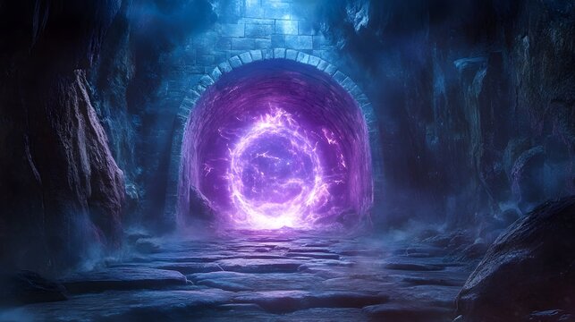 A mystical portal glows in a fantastical landscape, an ancient stargate with ornate details and bright light beckoning discovery.