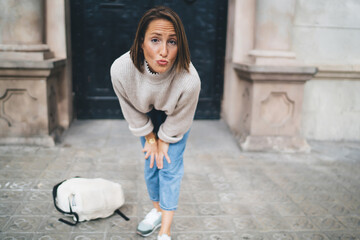 Woman with grimace stooping standing at building
