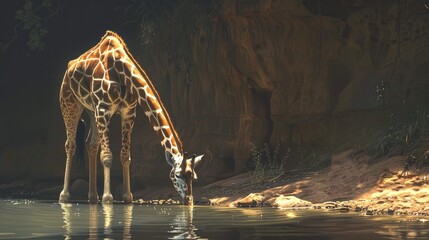 Giraffe stooping to sip water or feed