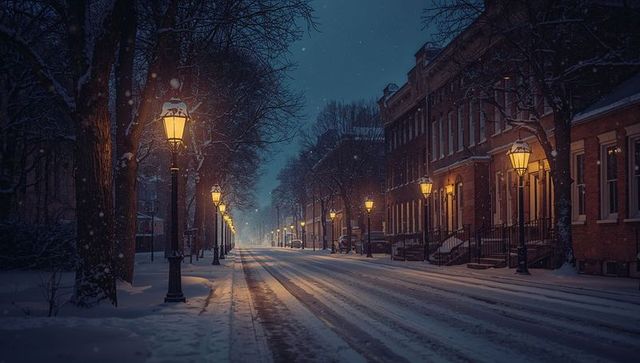 Snowy street glowing under vintage lamps at night, townhouses lining quiet road, falling snow