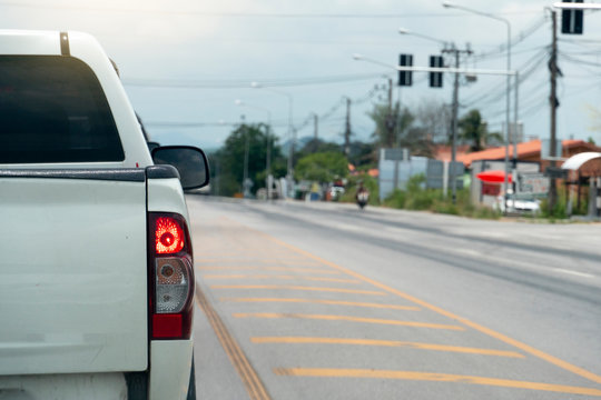 Backside of car on the road. Open light break. Stop waiting for the signal at the intersection.