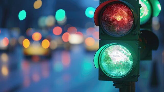 A traffic light with red and green signals shines brightly on an urban street at dusk, showcasing blurred vehicle lights in the city background.