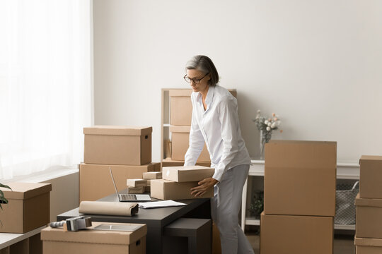 Serious mature businesswoman engaged in Internet store management, working on orders to customers, packing purchases on workplace table at stacked boxes in storage room