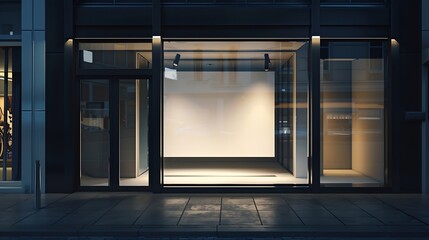 Mock up of store blank street showcase window in a city at night Front view : Generative AI
