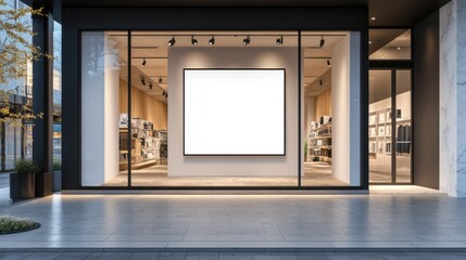 Commercial blank white signboard hanging vertically behind window glass of boutique or fashion store