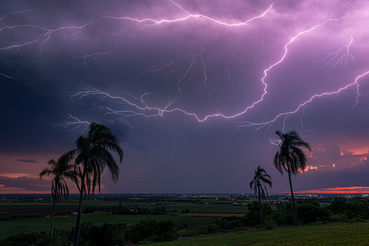 Purple thunderstorm clouds looming with lightning striking above suburban sunset lights