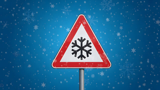 Winter-themed road sign warning against snow conditions transportation safety and cold season travel concept