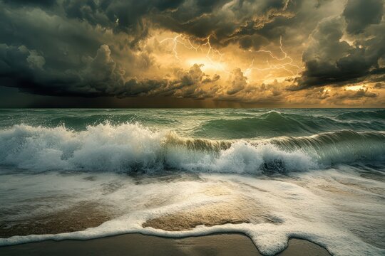 Dramatic ocean waves with stormy skies and lightning strikes
