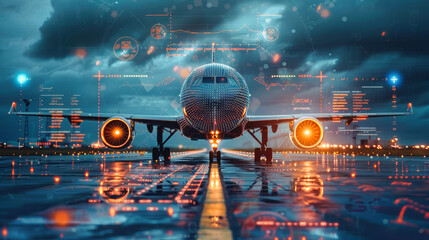A futuristic aircraft, adorned with glowing lights, sits on a wet runway under a stormy sky, preparing for takeoff