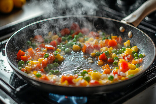 Colorful vegetables sautéing in a pan on the stove in the kitchen
