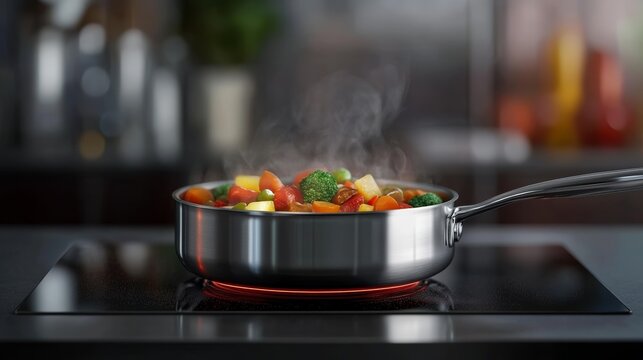 Sleek stainless steel pressure cooker on stovetop surrounded by fresh vegetables in modern kitchen