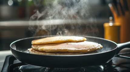 Close-up of blini being cooked on a cast-iron pan, a hand flipping the pancake with a spatula, authentic kitchen moment, soft steam, warm stovetop light, unstyled real-life kitchen