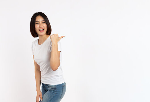 portrait of a Happy Asian woman smiling points her index finger at an empty space in the background and looks straight ahead on white background
