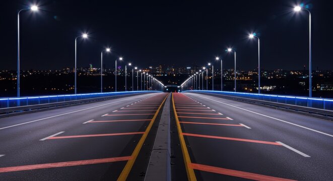 Modern highway bridge illuminated by streetlights at night, providing a symmetrical view of the road ahead towards the city.