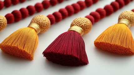 Decorative tassels in various colors arranged in a straight line against a neutral background