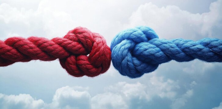 A fraying rope stretches between torn American and Canadian flags—symbolizing strained relations, diplomatic tension, and the fragility of cross-border unity.