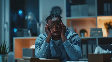 Struggling with infertility concerns at late night office setting by an anxious man focused on health issues