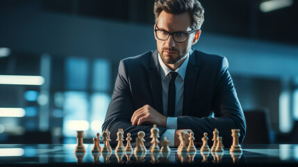 Professional manager making strategic decisions concept with a business man in front of a chessboard