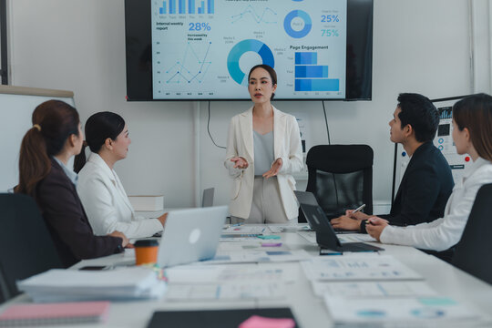 Asian businesswoman leads a meeting and gives a presentation with charts displayed on a screen to a group of colleagues sitting around a table in a modern boardroom