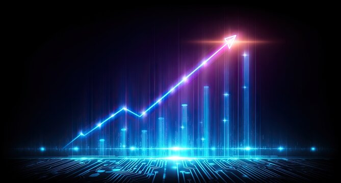Glowing blue bars and upward arrow over a circuit board pattern against a dark backdrop
