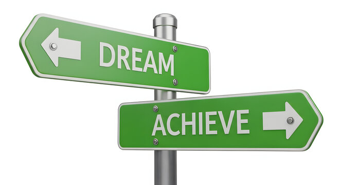 Dream or Achieve green direction arrows, street signs. 3D rendering isolated on transparent background