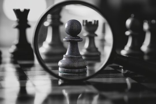A focused pawn  highlighting strategy on a chessboard with a magnifying glass effect