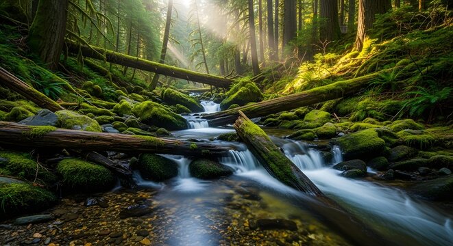 Serene temperate rainforest stream cascades over moss covered rocks and fallen logs bathed in soft ethereal sunbeams breaking through the canopy