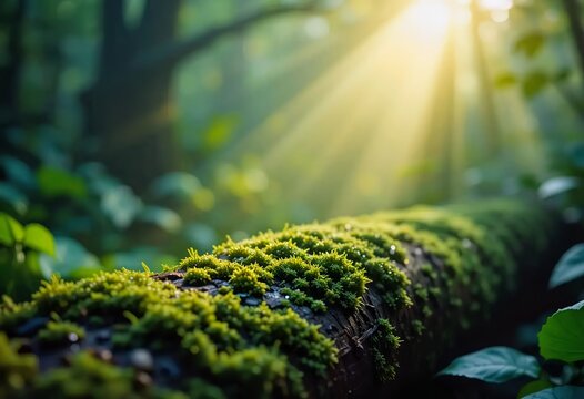 Close-up of moss-covered log in serene forest with sunlight background