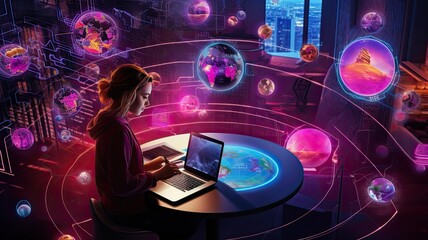 Woman in VR headset chooses movie or TV show to watch at home. 3D futuristic hologram shows interface of streaming service application and widgets in user menu. VFX animation. Concept of lifestyle.