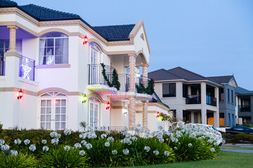 House on street corner at dusk with Christmas lights and decorations