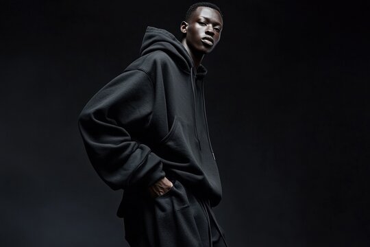Model stands confidently in an oversized black hoodie against a dark background, highlighting urban fashion aesthetics and modern streetwear style