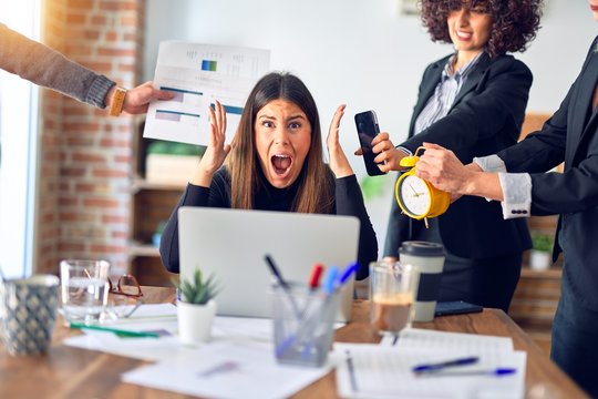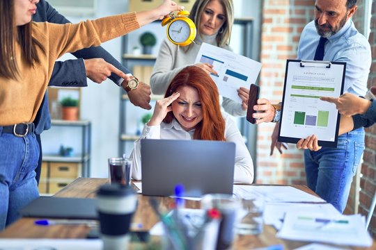 Group of business workers working together. Partners stressing one of them at the office