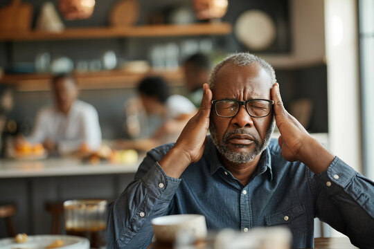 Stressed senior man with migraine in kitchen. An ideal image for conveying stress or health issues in a home setting. Suitable for medical, lifestyle, and health-related content.