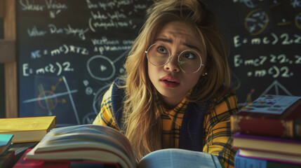 A thoughtful student rests her chin on her hands against a backdrop of complex equations on a chalkboard.