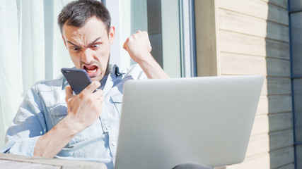 Angry businessman screaming on a phone while working behind computer from home. Stressful work environment concept.