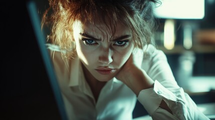Intense focused young woman working on computer home office digital work environment stressful atmosphere close-up view motivation