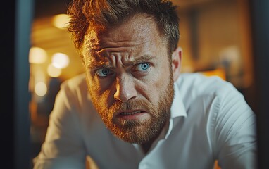 Frustrated businessman in professional office, struggling with computer problems, angry and upset expression, tense and stressful work environment, technology issues