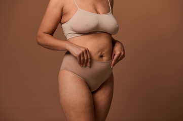 Close-up body of overweight woman with stretch marks and saggy belly after pregnancy, isolated on beige background with copy space for ads. Concept of love and acceptance, body positive.