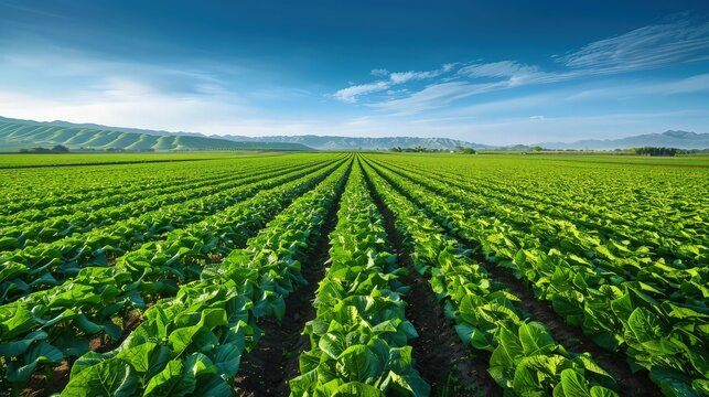 Vast agricultural fields under clear blue sky with copy space