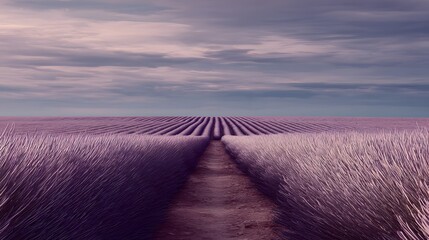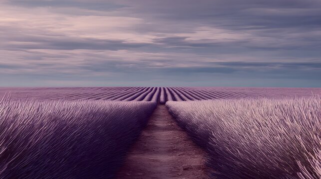 Lavender field stretching to horizon with symmetrical rows and central track under blue sky