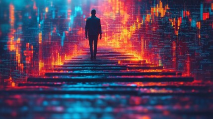 A solitary man strides along a glowing pathway, immersed in a digital landscape filled with vivid data patterns and colorful lights.
